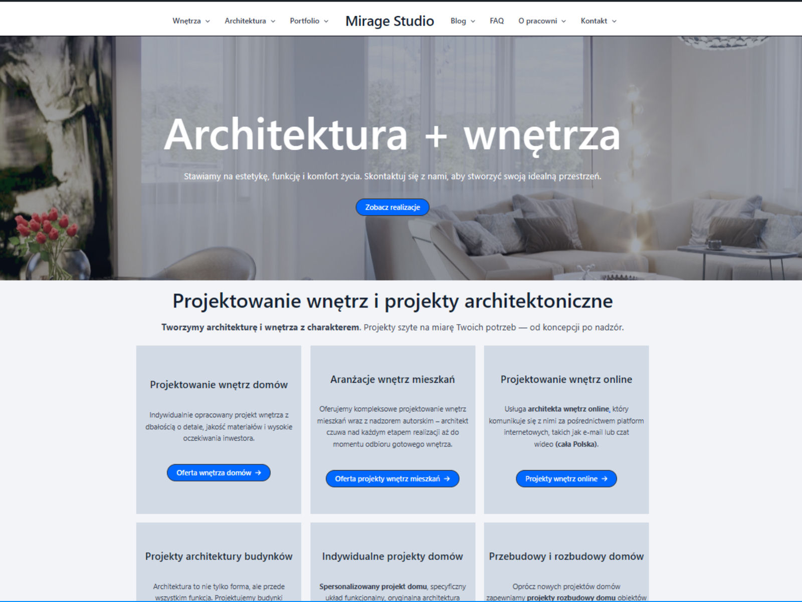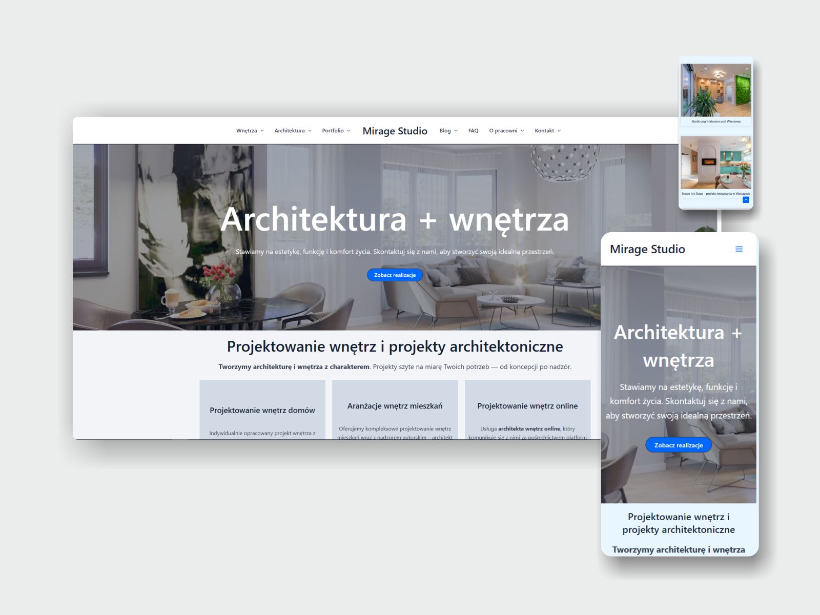 Elegant and minimalistic portfolio website for Mirage Studio, an interior architecture firm based in Warsaw. Focused on calm design, space and light.